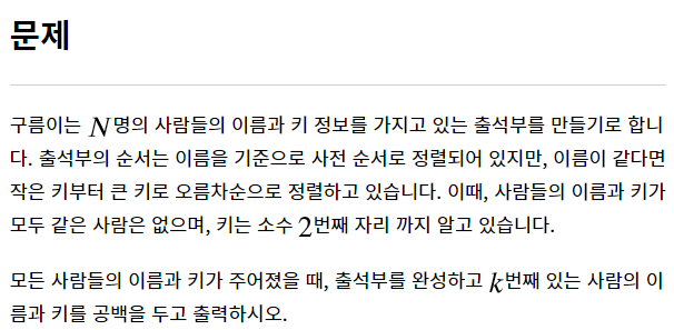 C++ STL의 sort는 문자열로 사전순으로 정렬해 준다는 것을 알고 있었기 때문에 출석부를 정렬하는 것 자체는 어렵지 않았다. 다만 double형 실수를 아무런 처리 없이 출력해주는 경우 110.40 같이 끝이 0으로 끝나는 실수를 110.4로 출력해버리는 문제가 발생했다.