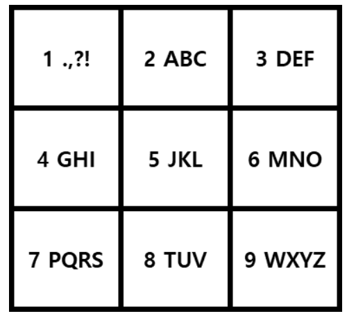 9개의 입력 버튼으로 이루어져 있으며, 각 버튼의 첫 번째 숫자로 버튼을 부를 수 있다. 한 번 버튼을 누르면 숫자가 입력이 되고, 여러 번 누르면 자판에 보이는 문자들로 순서대로 바뀐다.