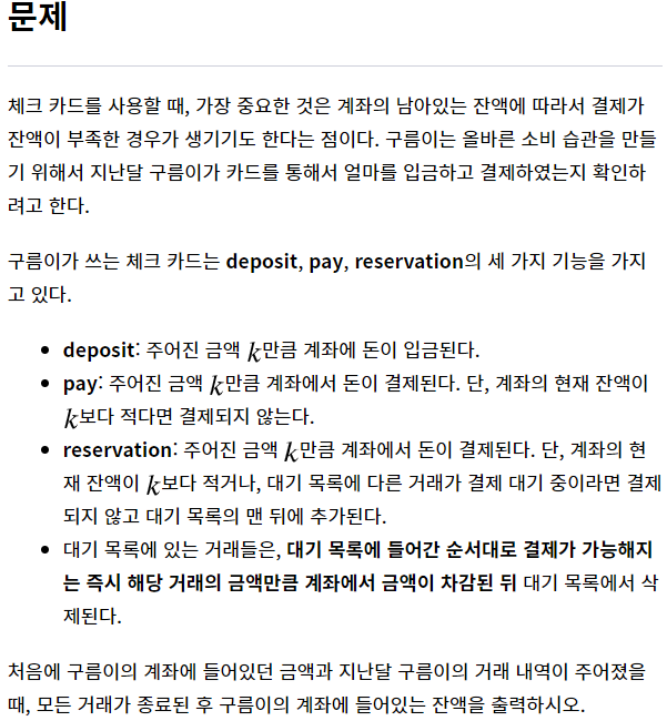 문제를 다시 한번 읽어 보며 놓친 조건이 무엇인지 생각해 보았고 reservation시 계좌에 돈이 충분해도 대기 중인 결제가 하나라도 존재하면 결제하지 않고 결제 대기 목록에 추가해야 한다는 조건을 만족하도록 로직을 수정해 주었다.