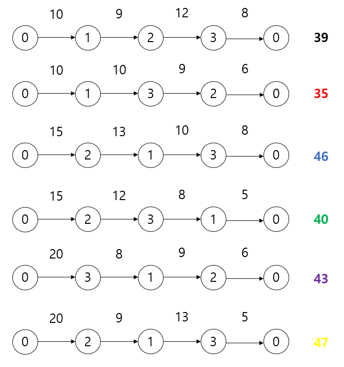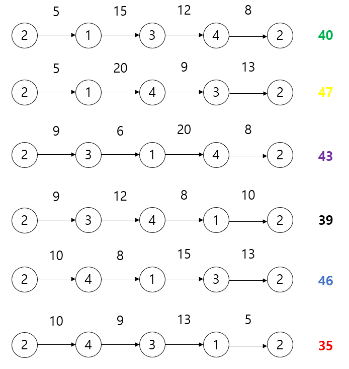 이에 따라 0 -> 3 -> 1 -> 2 -> 0 을 순회할 때 2->0으로 가는 비용은 다시 구할 필요가 없게 되는 것이다.