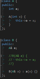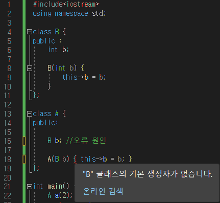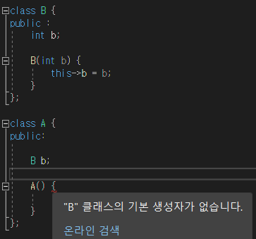 따라서 위의 경우 B클래스에 default 생성자가 없는데 B b; 객체화 시 default 생성자를 호출하기 때문에 오류가 발생하는 것이었다.