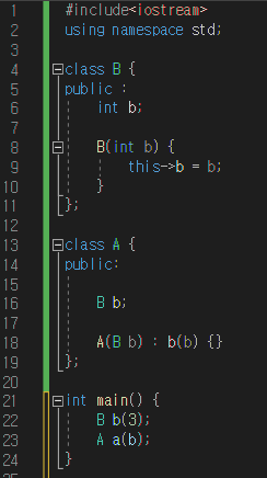 오류 원인은 B b;(line 16) 선언부이지 생성자 초기화 부분이 아니다.